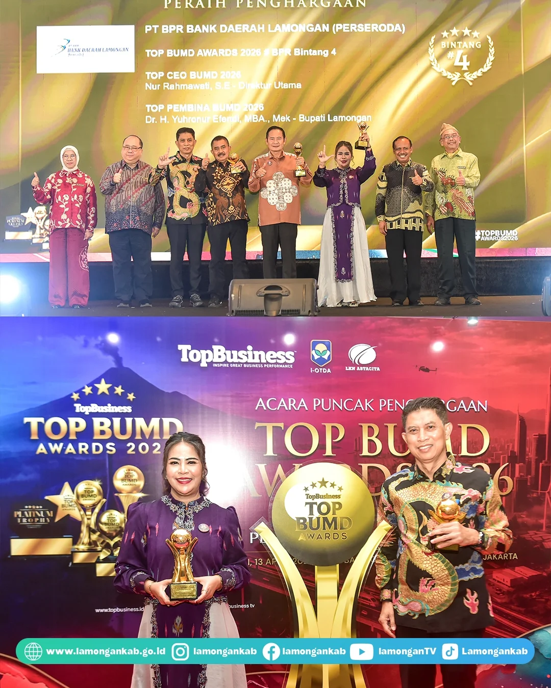 Pada ajang tersebut, PT. BPR Bank Daerah Lamongan juga berhasil meraih penghargaan Bintang 4 Top BUMD 2026, sebagai bentuk apresiasi atas kinerja perusahaan yang unggul dan berkelanjutan. Selain itu, Direktur Utama Rahmawati juga turut dianugerahi penghargaan Top CEO 2026 atas kepemimpinannya dalam meningkatkan daya saing perusahaan.