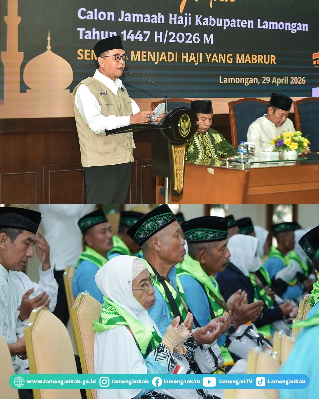 Pemerintah Kabupaten Lamongan secara resmi memberangkatkan jamaah haji tahun 2026. Pada hari ini, total akan diberangkatkan lima kloter. Pada pemberangkatan kloter 30 dan kloter 31 dilakukan langsung oleh Bupati Lamongan Yuhronur Efendi, Rabu (29/4) di Pendopo Lokatantra pagi ini.